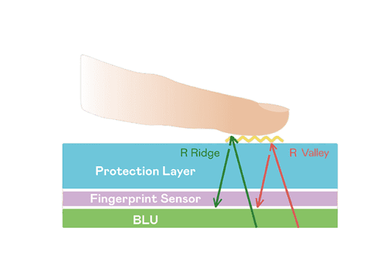 TFT 指纹扫描感测技术利用薄膜电晶体 (TFT) 当作光感测元件,,,藉由非晶硅 (a-Si) 与低温多晶硅(LTPS)既有光电转换特性对不同波段光源进行吸收,,,使感测 IC 读取阵列感测元件的光漏电差异,,转换成数位灰阶影像。。
